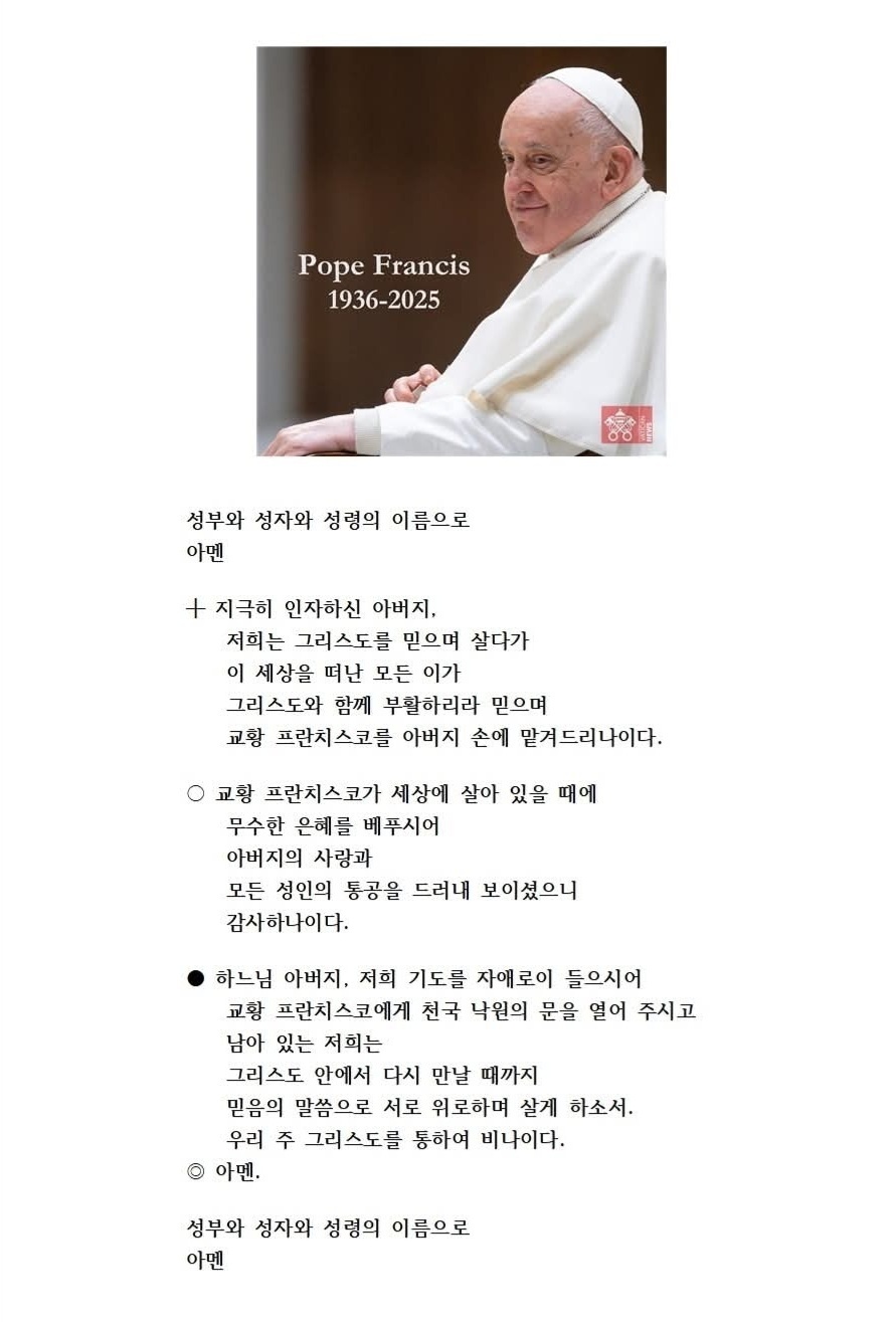 프란치스코 교황님께서는 지상 생활의 마지막 여정을 하느님 섭리에 오롯이 내맡기시면서도 끝까지 세상에 관심을 두시며 전쟁과 반목이 없는 온전한 평화를 염원하셨습니다. 이로써 교황님께서는 아름답게 하느님 품으로 돌아가시는 모범을 온 세계에 보여 주셨습니다.